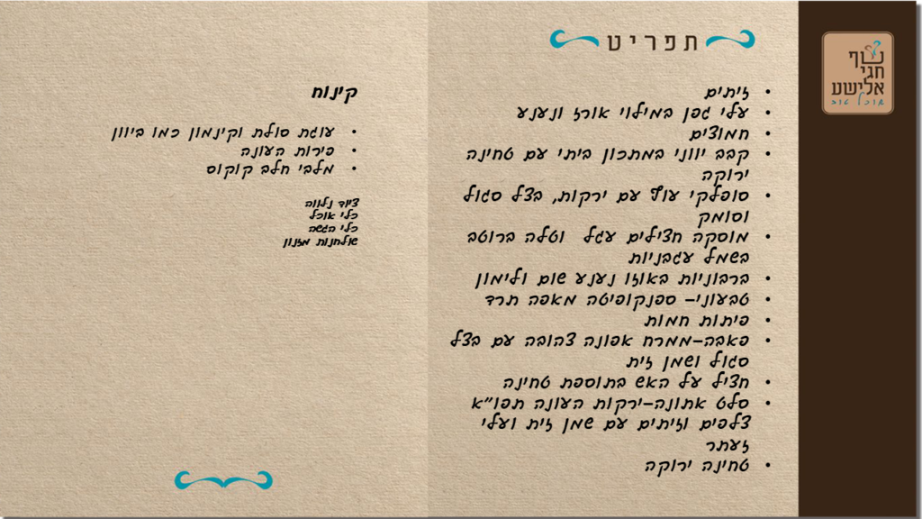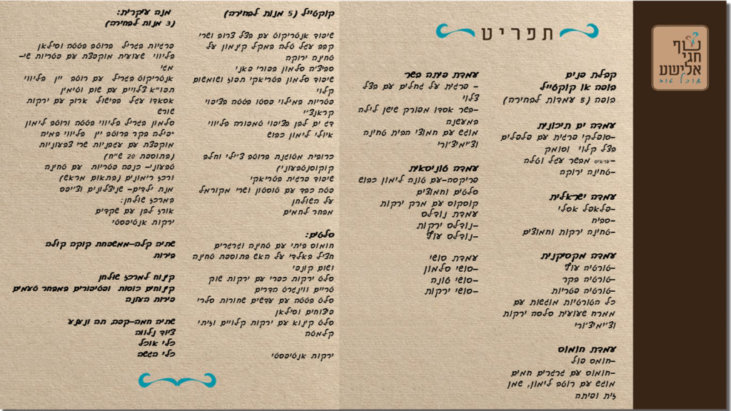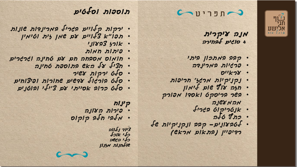 ייתכנו שינויים בהתאם לעונה, למצרכים ולהתאמה לצרכי הלקוח